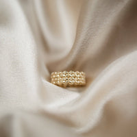 Inspired by traditional methods of weaving, this ring is a classic. Woven textures add just the right amount of interest in this minimalist design. The highly polished surface will develop a beautiful patina with wear, for exceptional elegance over time. This modern repeating pattern band is designed for comfort and everyday wear. The perfect subtle statement, easy to layer and stack with other rings.